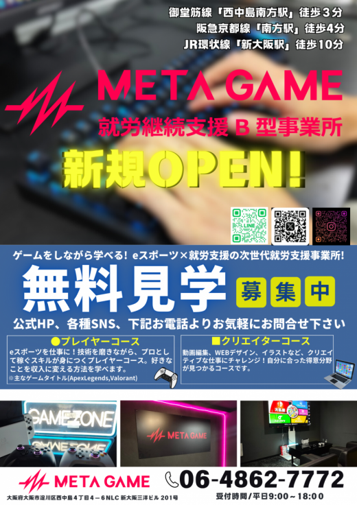 メタゲーム西中島は安心で楽しく通える事業所です。万全に整った環境で一緒に楽しくメタゲームライフを過ごしましょう!